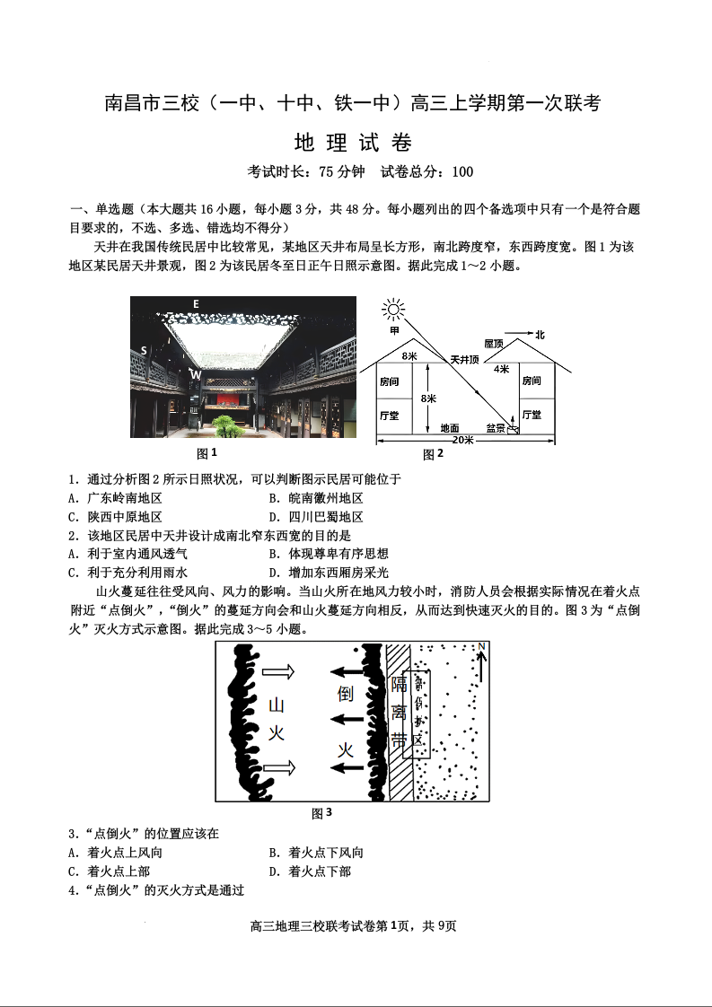 江西省南昌市三校(南昌市第一中学、南昌市铁路第一中学、南昌市第十中学)2023-2024学年高三上学期第一次联考 地理