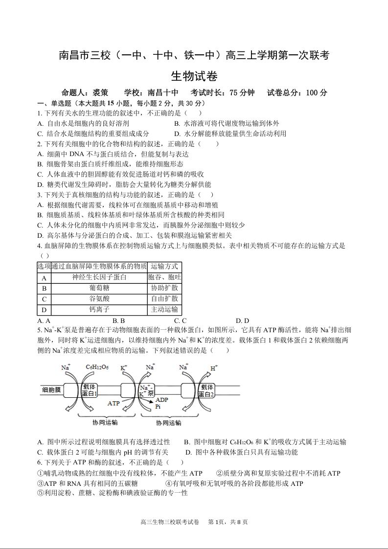 江西省南昌市三校(南昌市第一中学、南昌市铁路第一中学、南昌市第十中学)2023-2024学年高三上学期第一次联考 生物
