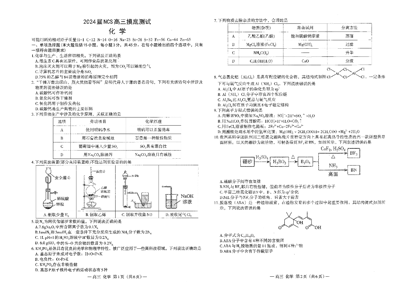 江西省南昌市2023-2024学年高三上学期开学考试(南昌零模) 化学