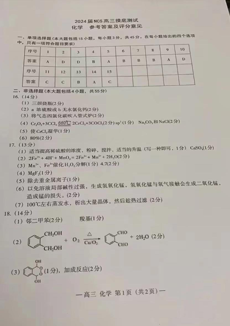 江西省南昌市2023-2024学年高三上学期开学考试(南昌零模) 化学答案