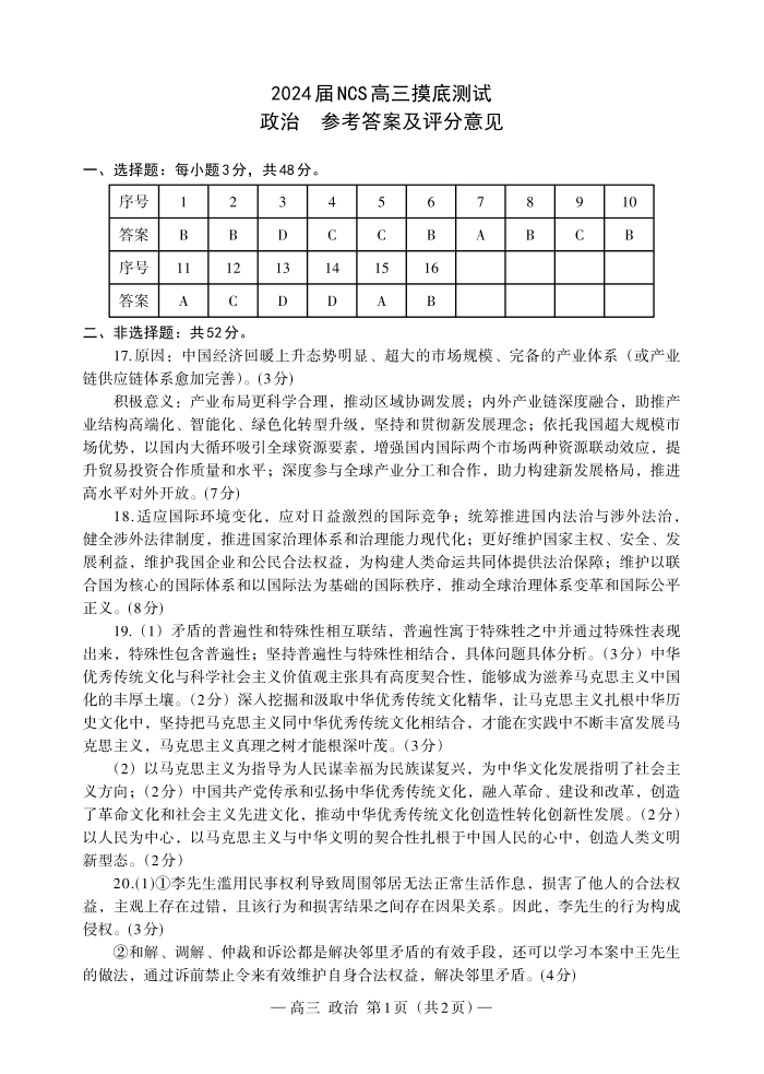 江西省南昌市2023-2024学年高三上学期开学考试(南昌零模) 政治答案