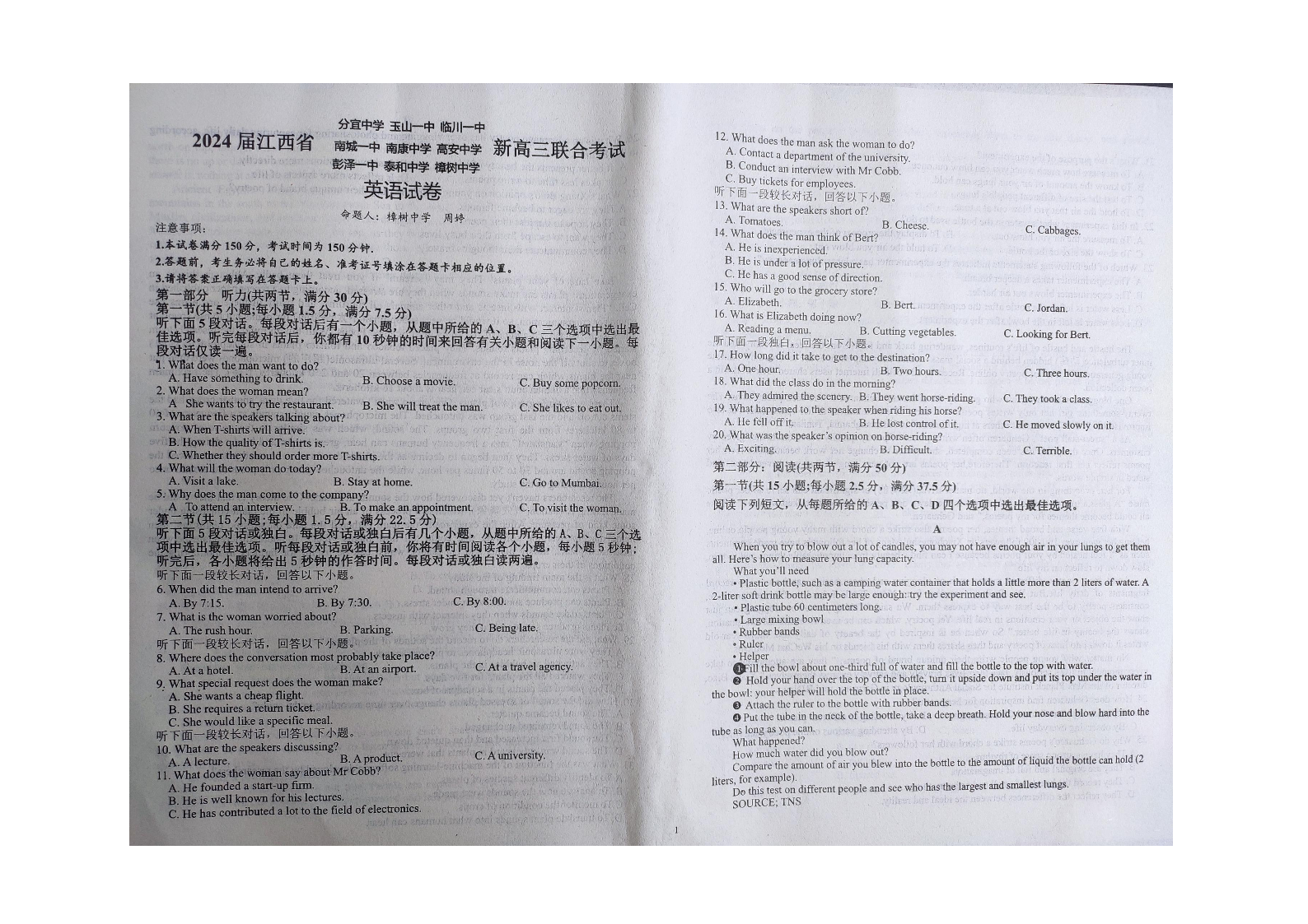 江西省九校联盟2023-2024学年高三上学期8月联合考试 英语