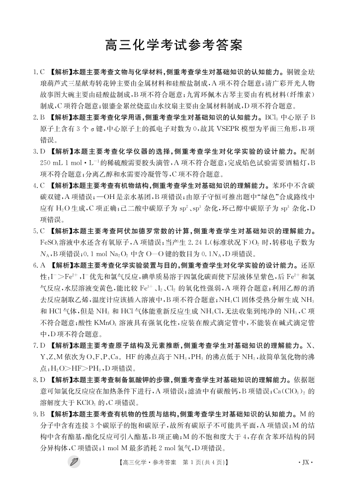 江西省九江市同文中学多校联考2024届高三下学期3月月考 化学答案