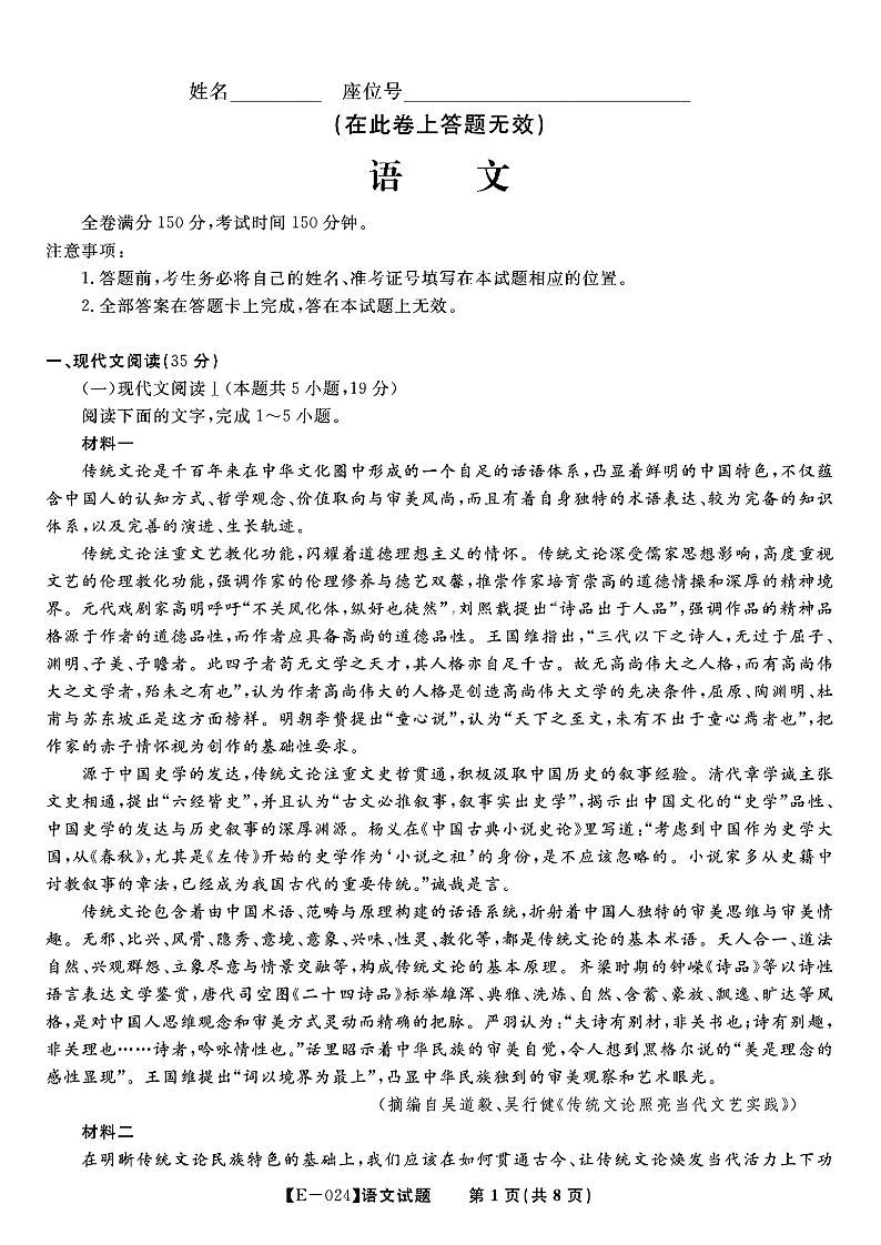 江西省九江市十校2023-2024学年高三第二次联考 语文