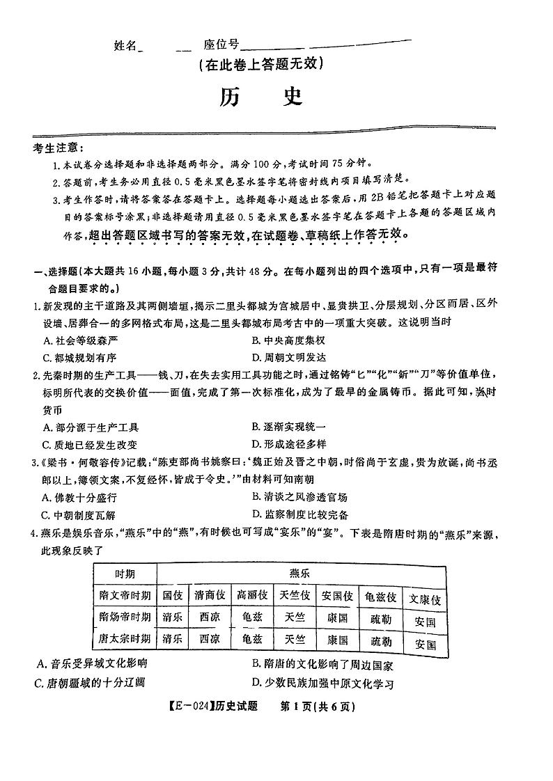 江西省九江市十校2023-2024学年高三第二次联考 历史