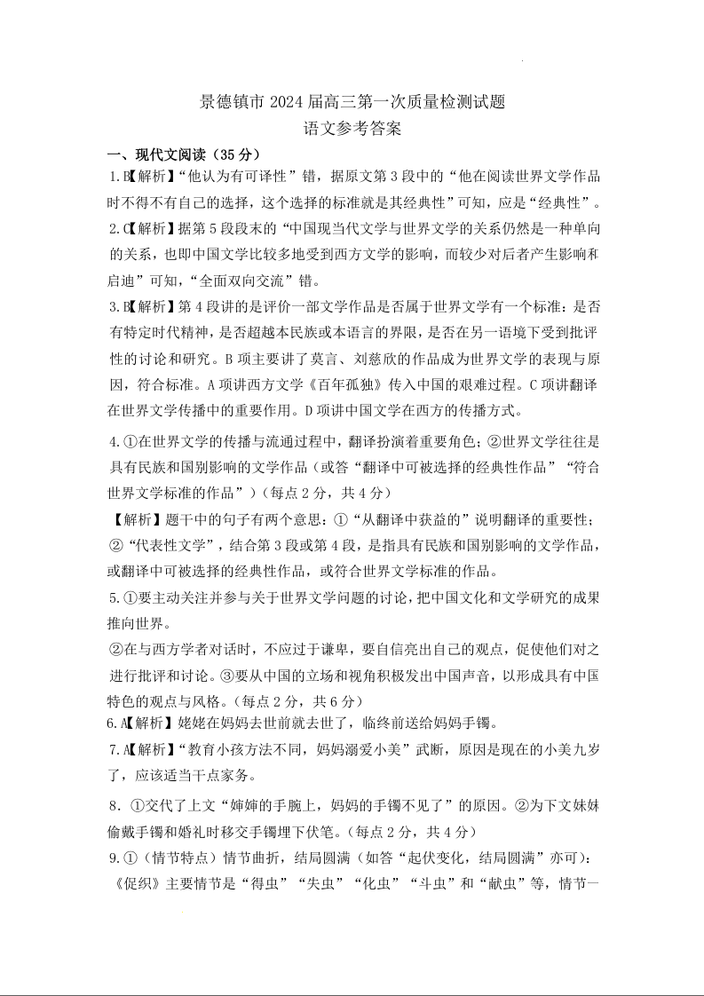 江西省景德镇市2023-2024学年高三上学期第一次质量检测 语文答案