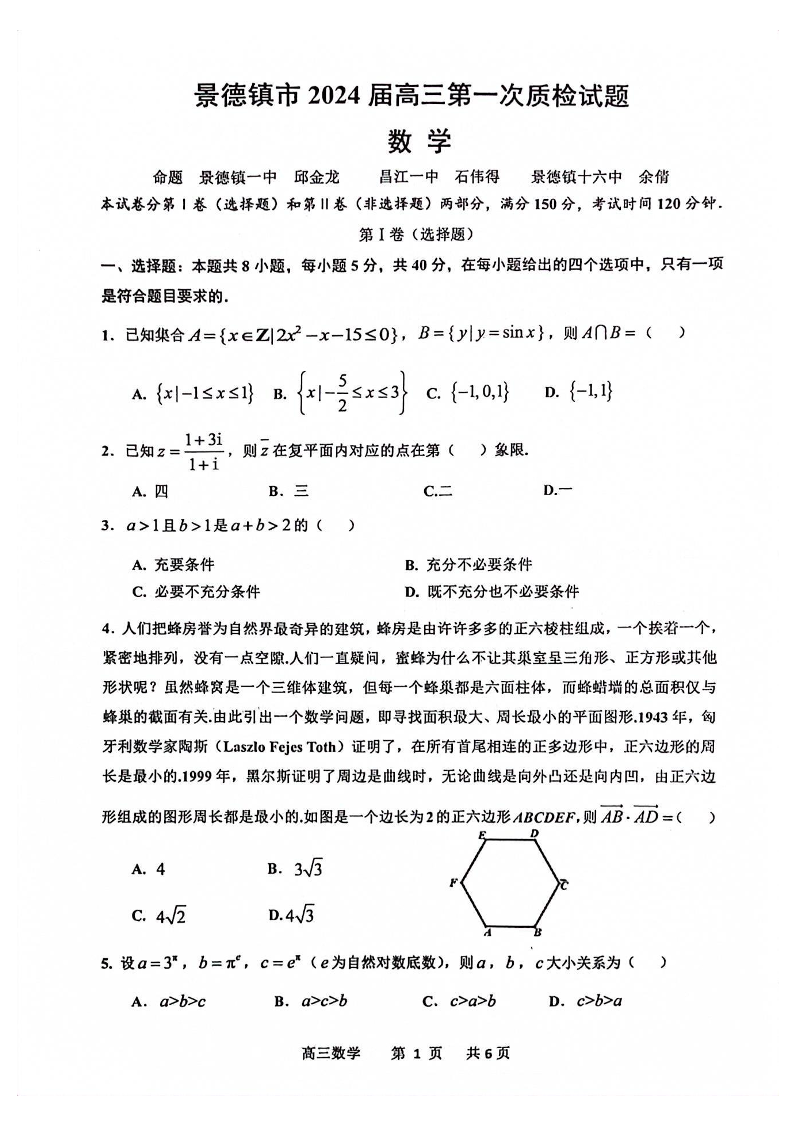 江西省景德镇市2023-2024学年高三上学期第一次质量检测 数学