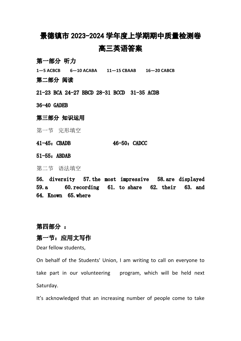 江西省景德镇市2023-2024学年高三上学期第一次质量检测 英语答案