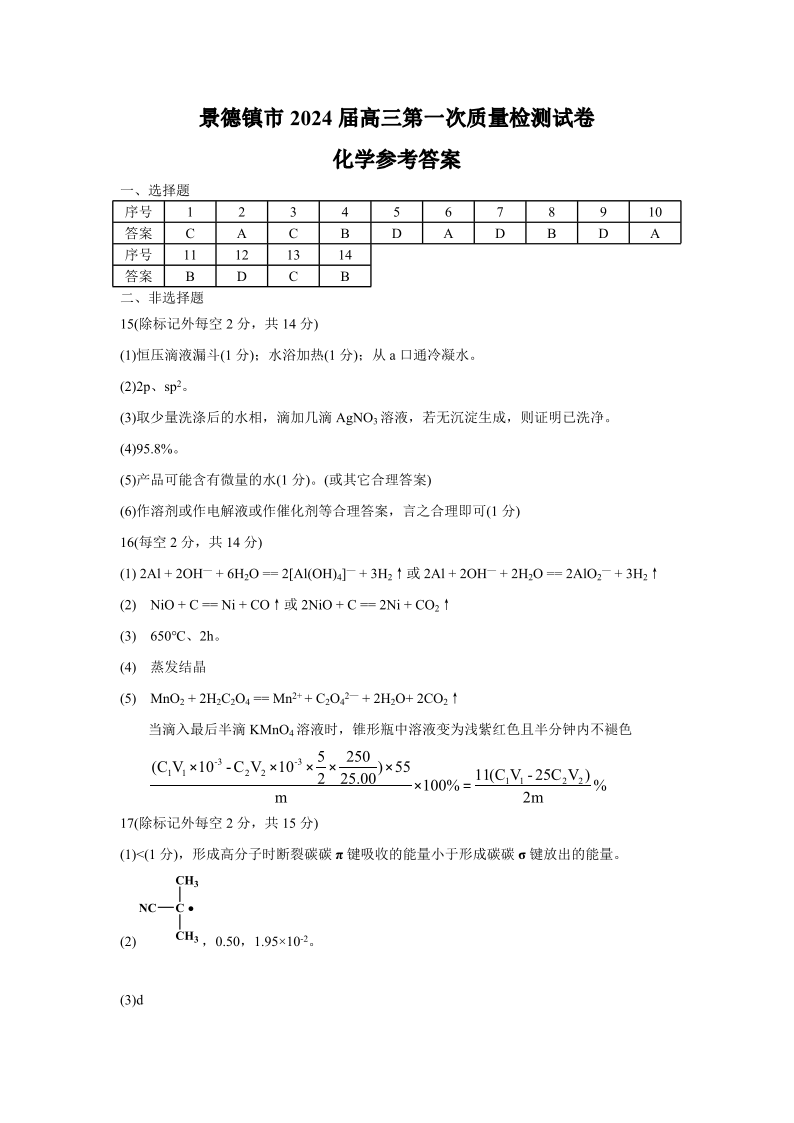 江西省景德镇市2023-2024学年高三上学期第一次质量检测 化学答案