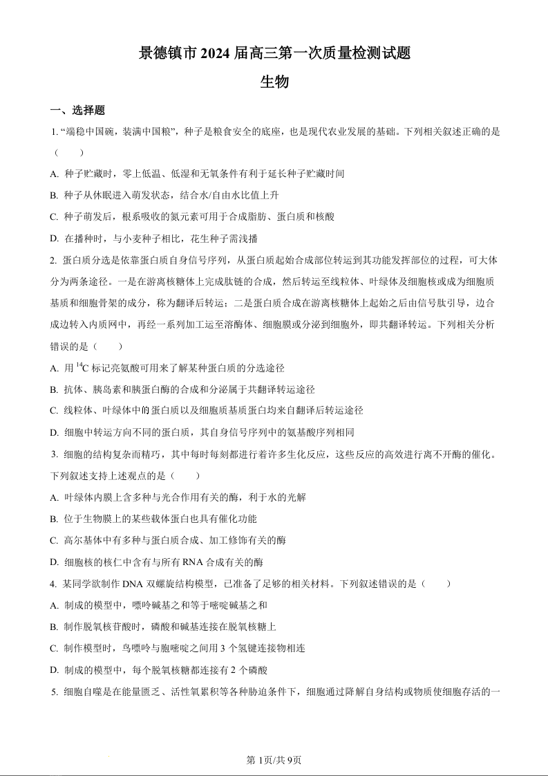 江西省景德镇市2023-2024学年高三上学期第一次质量检测 生物