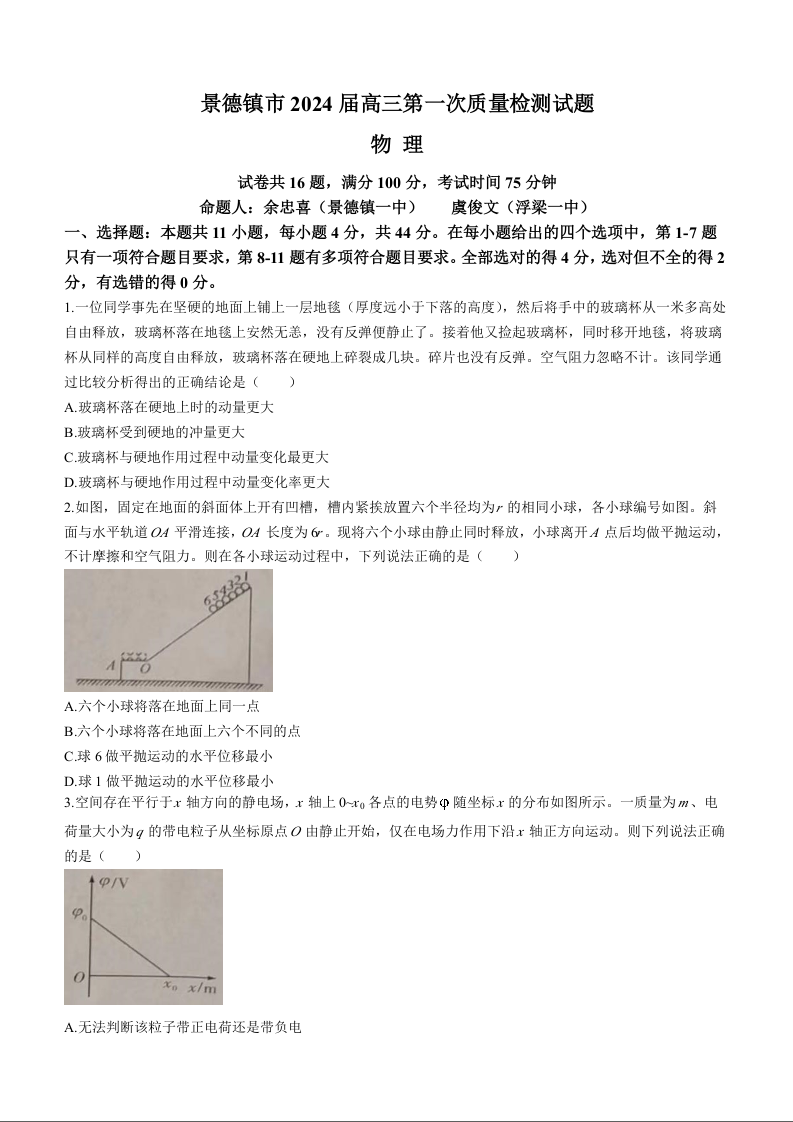 江西省景德镇市2023-2024学年高三上学期第一次质量检测 物理