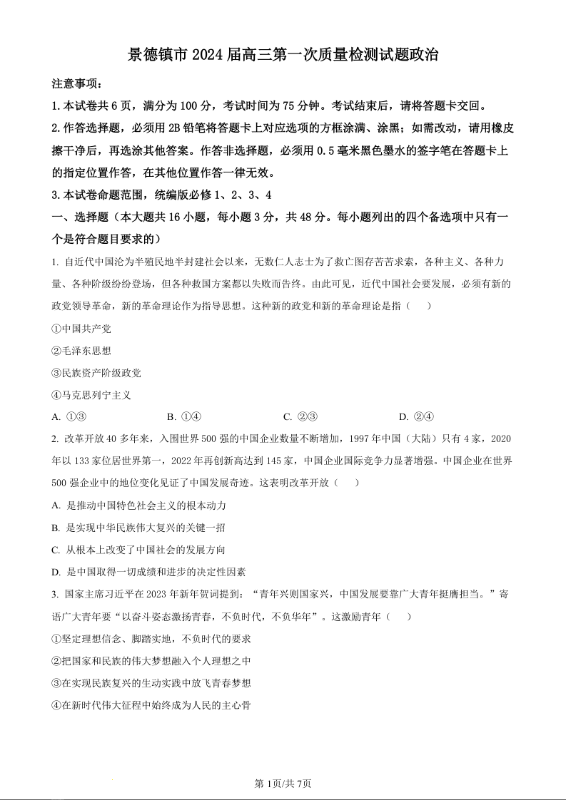 江西省景德镇市2023-2024学年高三上学期第一次质量检测 政治