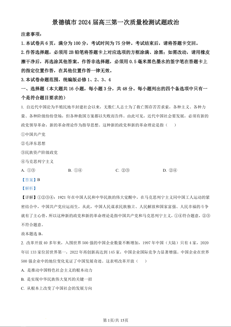 江西省景德镇市2023-2024学年高三上学期第一次质量检测 政治答案