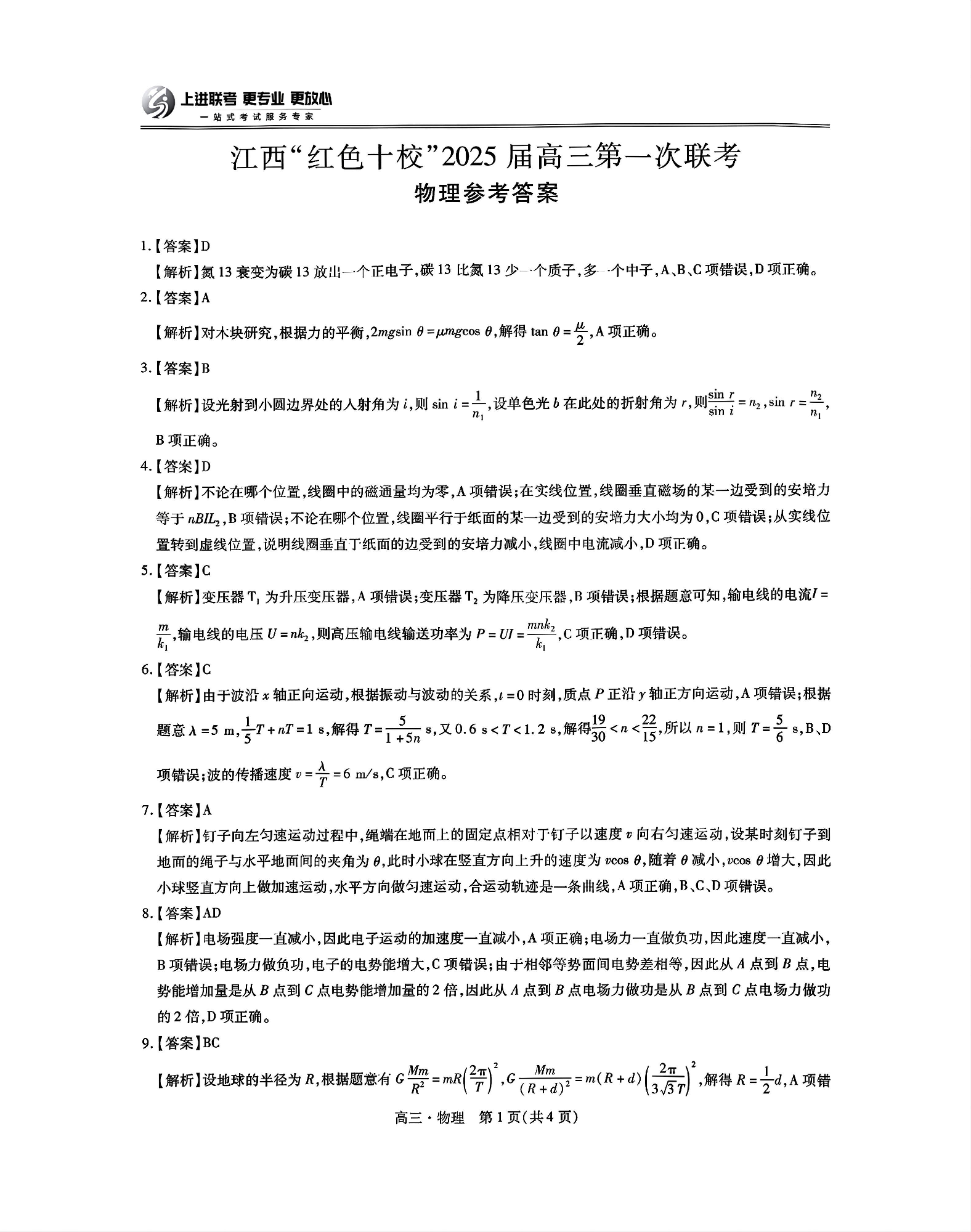 江西省红色十校2025届高三上学期第一次联考+物理答案