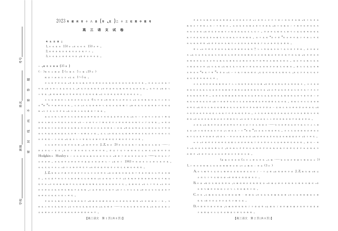 江西省赣州市十八县二十三校2023-2024学年高三上学期期中联考 语文
