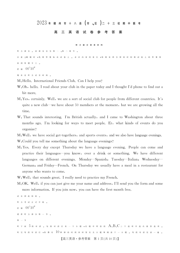 江西省赣州市十八县二十三校2023-2024学年高三上学期期中联考 英语答案