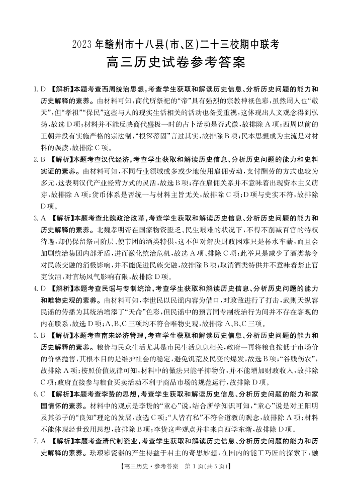 江西省赣州市十八县二十三校2023-2024学年高三上学期期中联考 历史答案