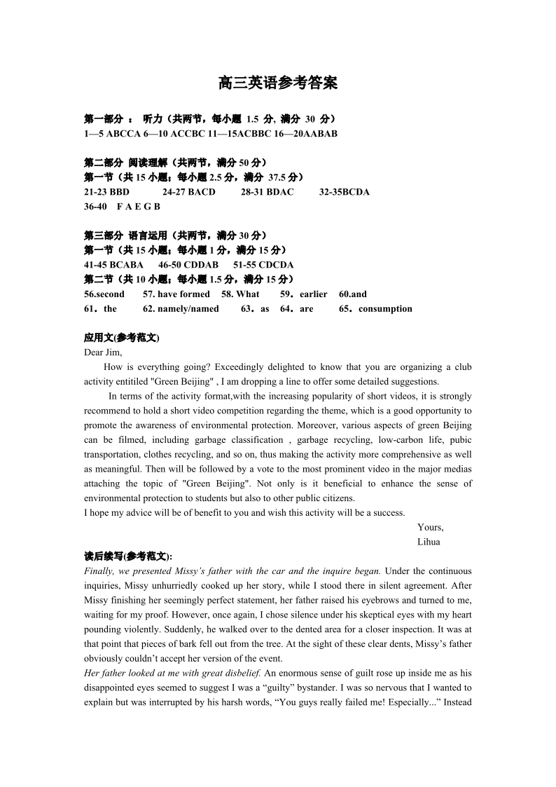 高三英语参考答案