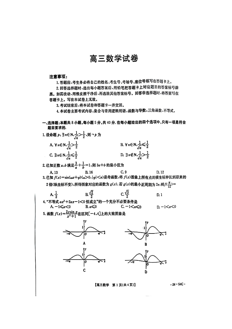 江西省部分高中学校2024届高三9月大联考 数学试卷