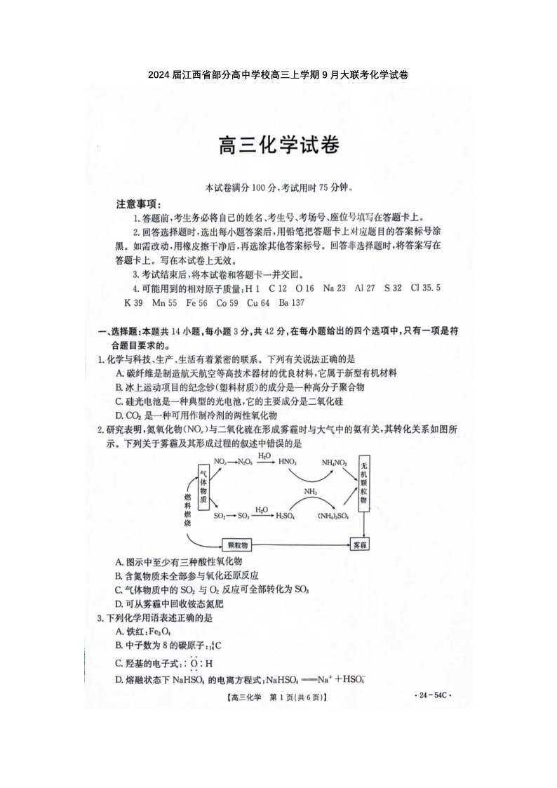 江西省部分高中学校2024届高三9月大联考 化学试卷