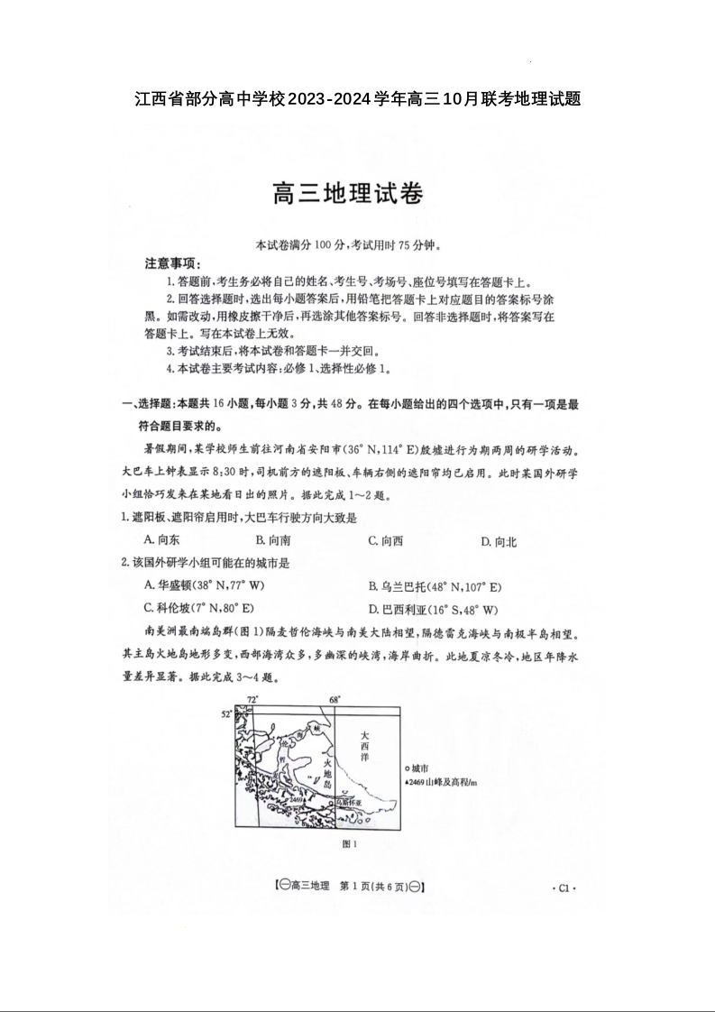 江西省部分高中学校2023-2024学年高三上学期10月联考 地理