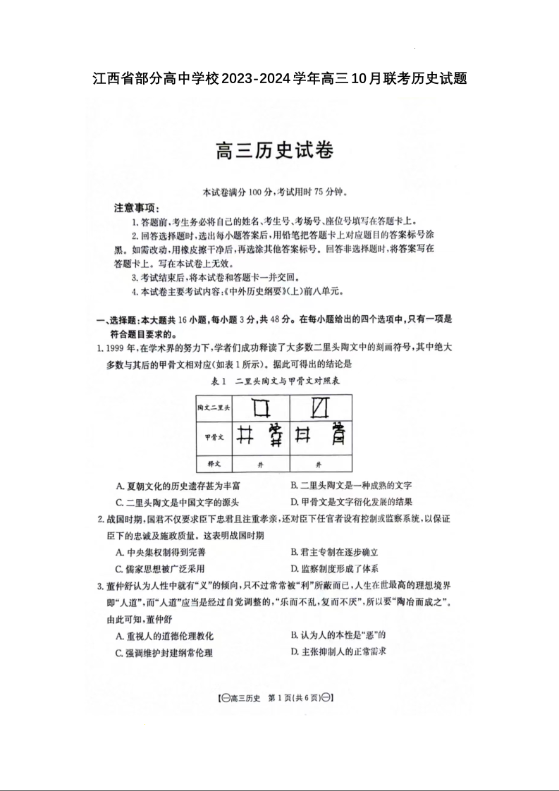 江西省部分高中学校2023-2024学年高三上学期10月联考 历史