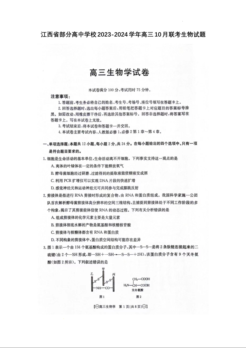 江西省部分高中学校2023-2024学年高三上学期10月联考 生物