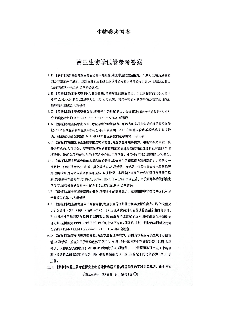 江西省部分高中学校2023-2024学年高三上学期10月联考 生物参考答案