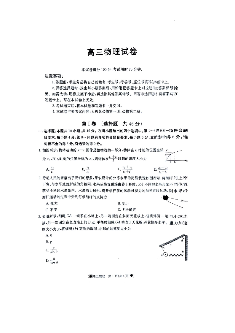 江西省部分高中学校2023-2024学年高三上学期10月联考 物理