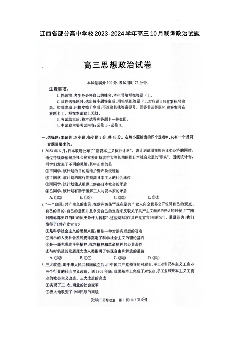 江西省部分高中学校2023-2024学年高三上学期10月联考 政治