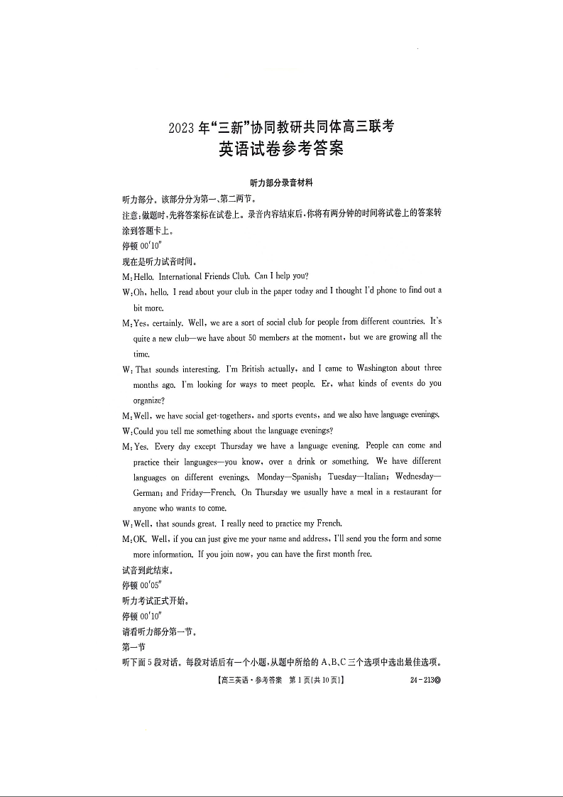 江西省“三新”协同教研共同体2023-2024学年高三上学期12月联考 英语答案