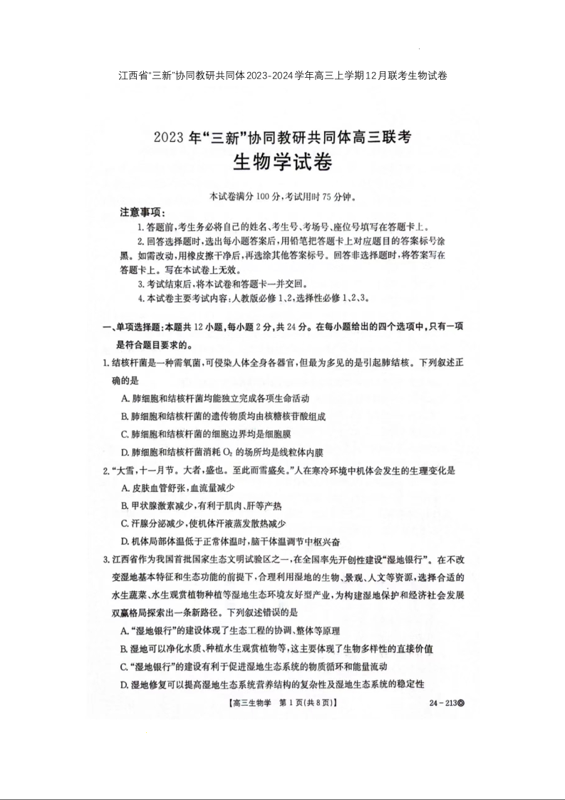 江西省“三新”协同教研共同体2023-2024学年高三上学期12月联考 生物