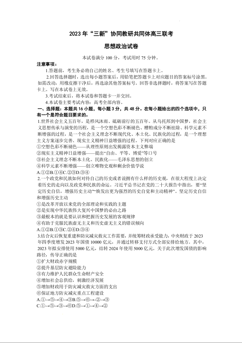 江西省“三新”协同教研共同体2023-2024学年高三上学期12月联考 政治