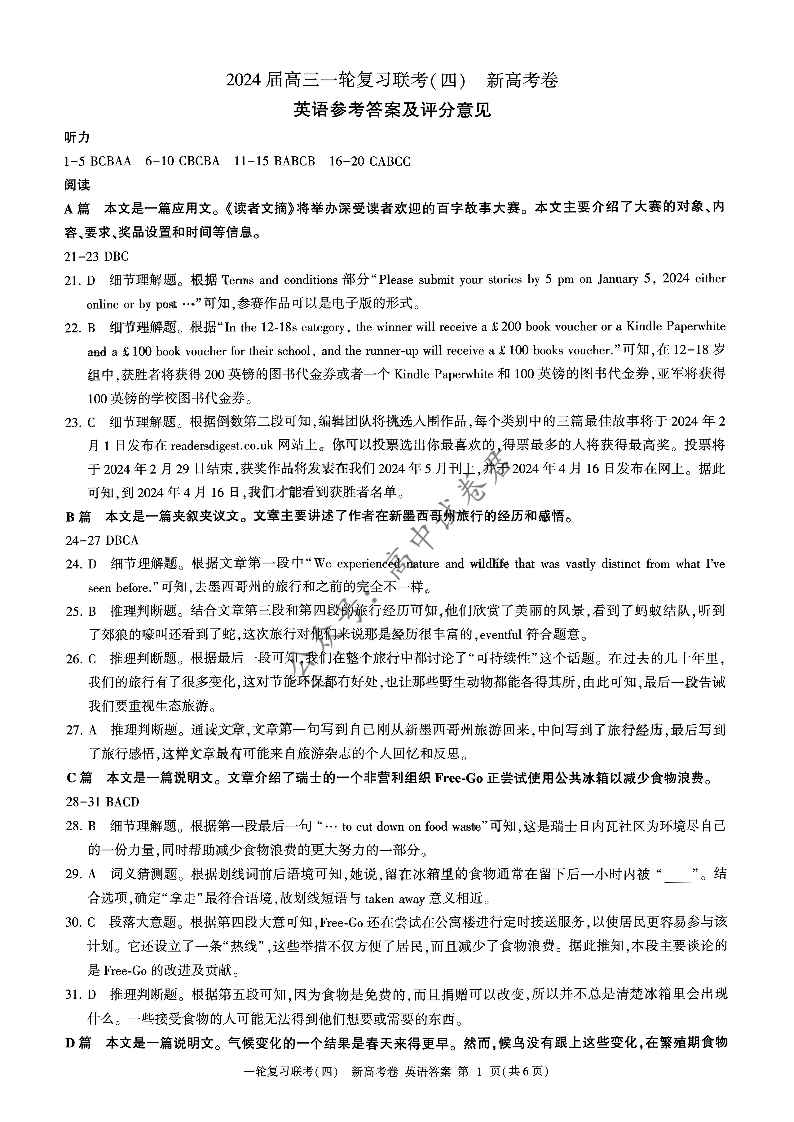 百师联盟2023-2024学年高三上学期一轮复习联考(四) 英语答案