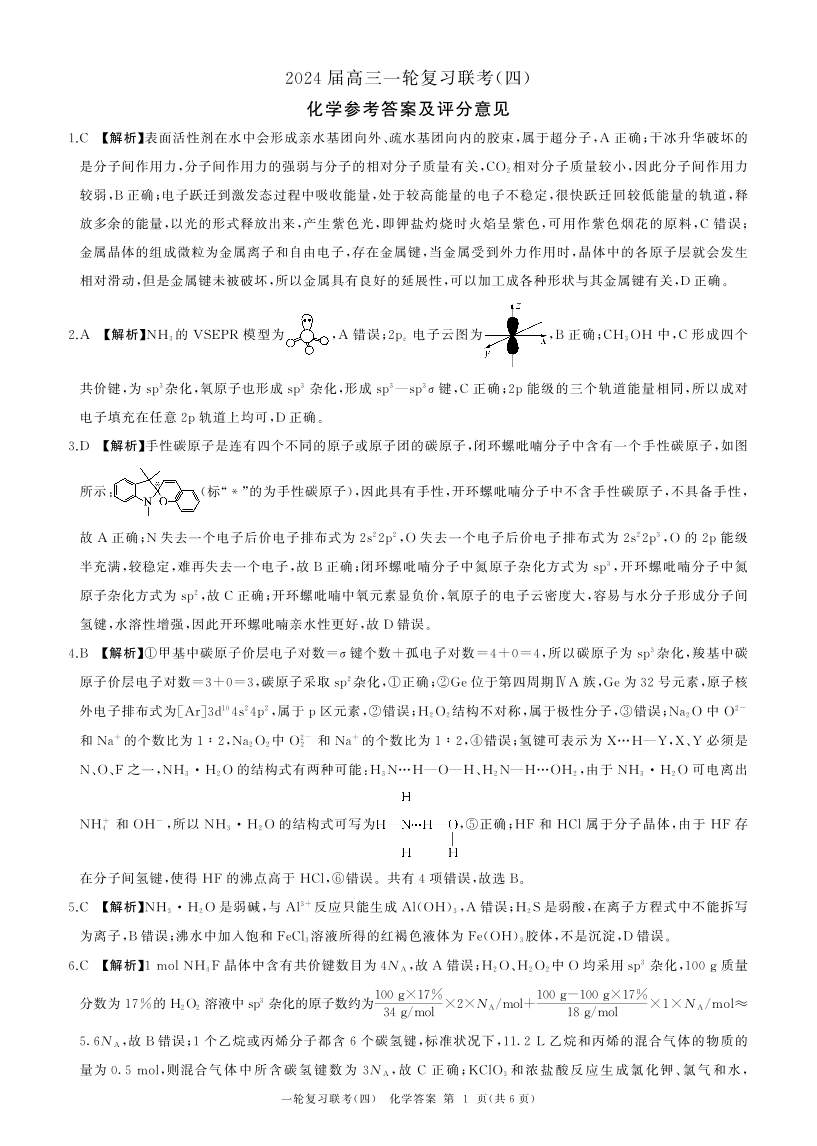 百师联盟2023-2024学年高三上学期一轮复习联考(四) 化学答案