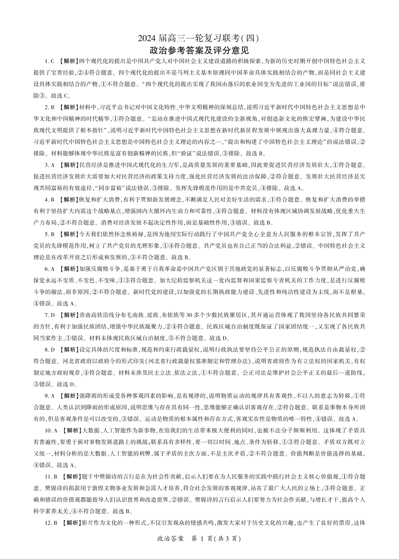 百师联盟2023-2024学年高三上学期一轮复习联考(四) 政治答案