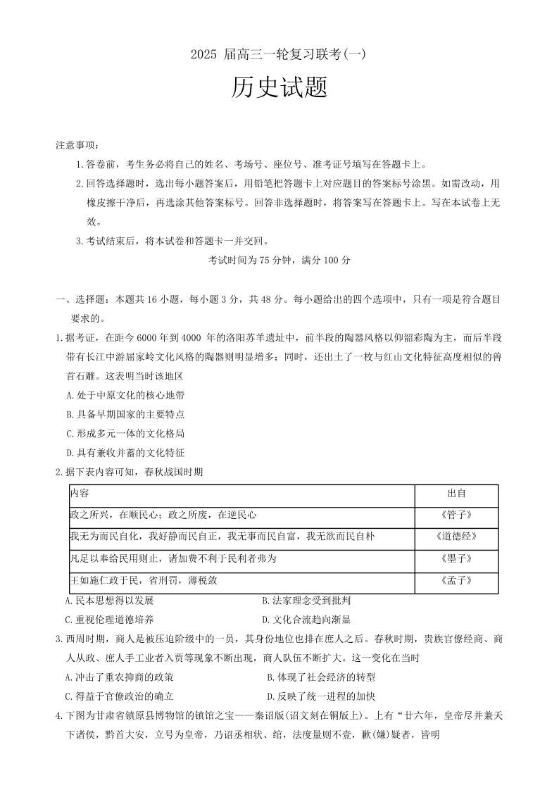 2025届百师联盟高三一轮复习联考(一)历史