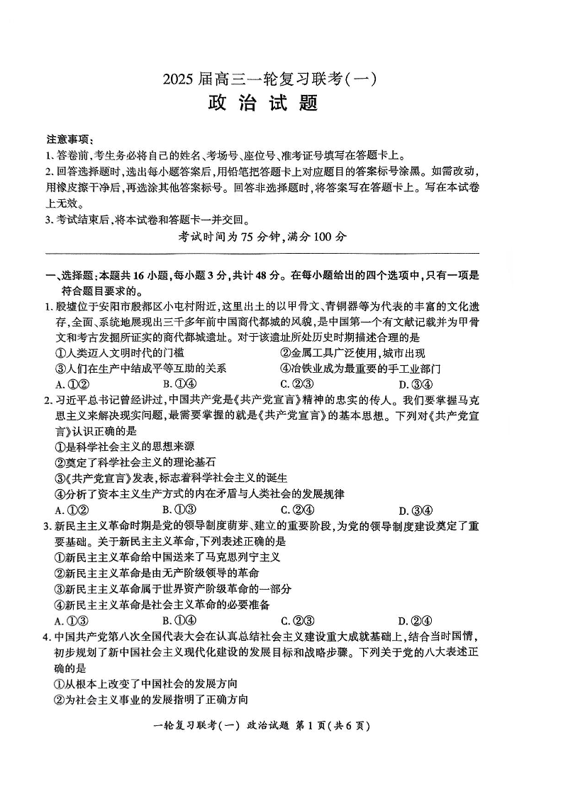 2025届百师联盟高三一轮复习联考(一)政治