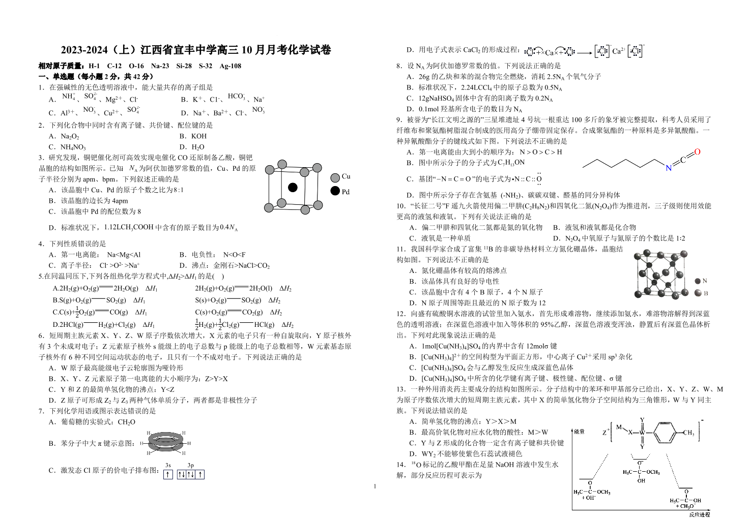 江西省宜春市宜丰中学创新部2024届高三上学期10月月考 化学