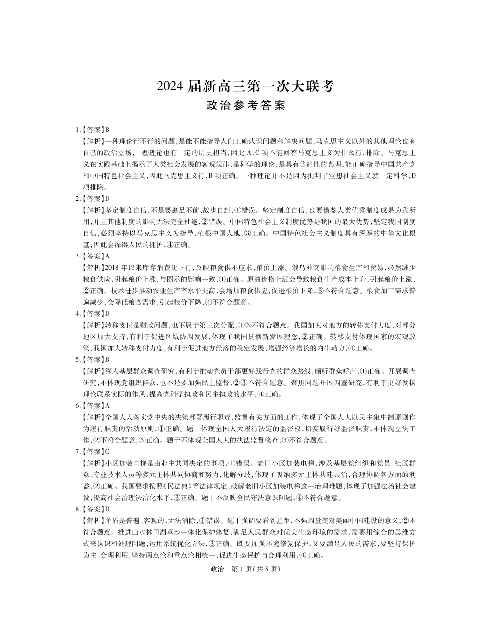 2024届江西省新高三第一次稳派大联考 政治答案