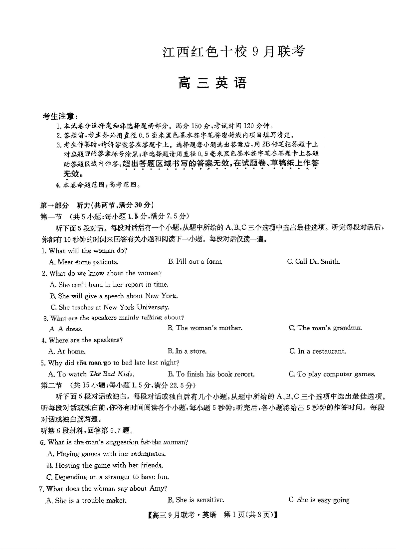 2024届江西省红色十校高三上学期9月联考 英语