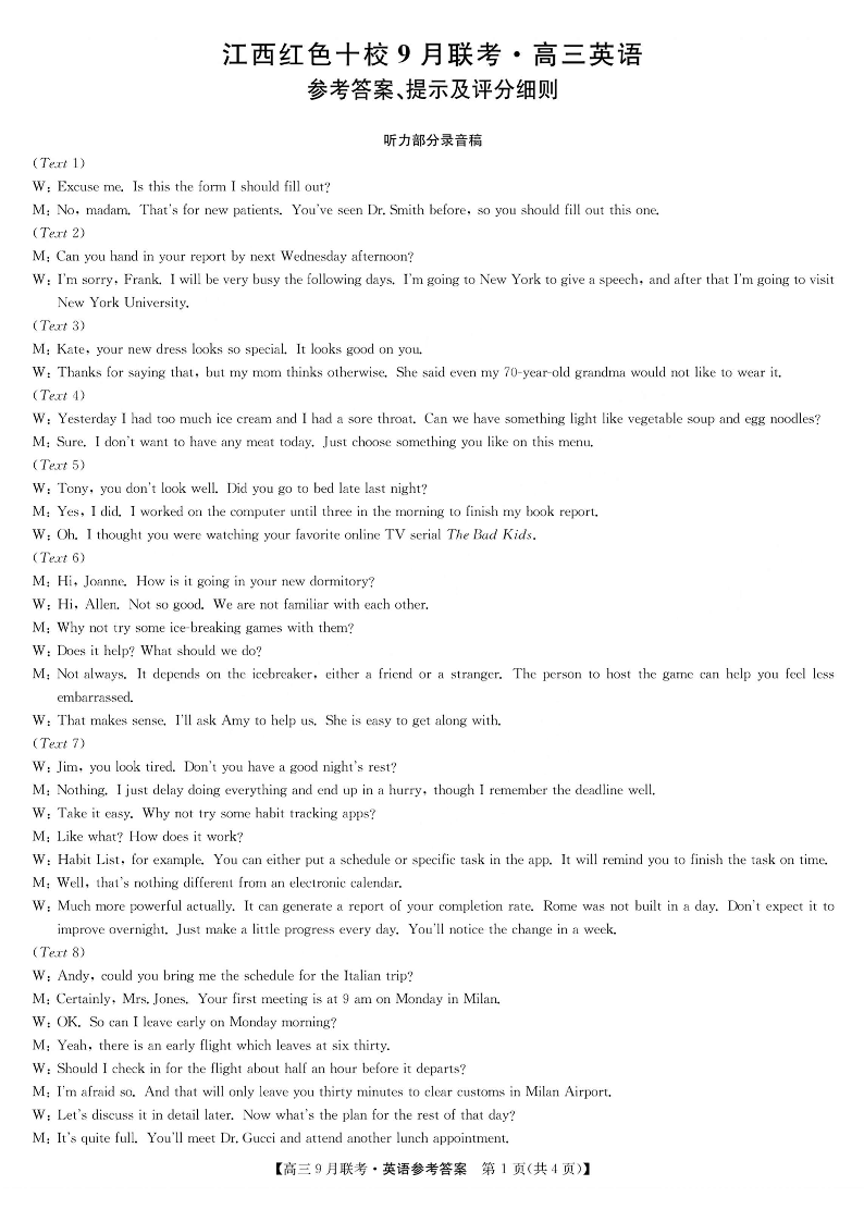 2024届江西省红色十校高三上学期9月联考 英语答案