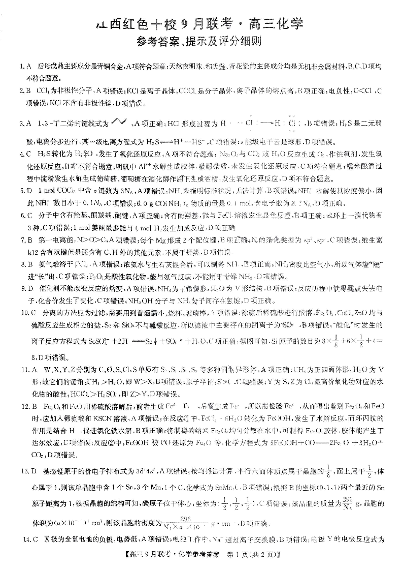 2024届江西省红色十校高三上学期9月联考 化学答案