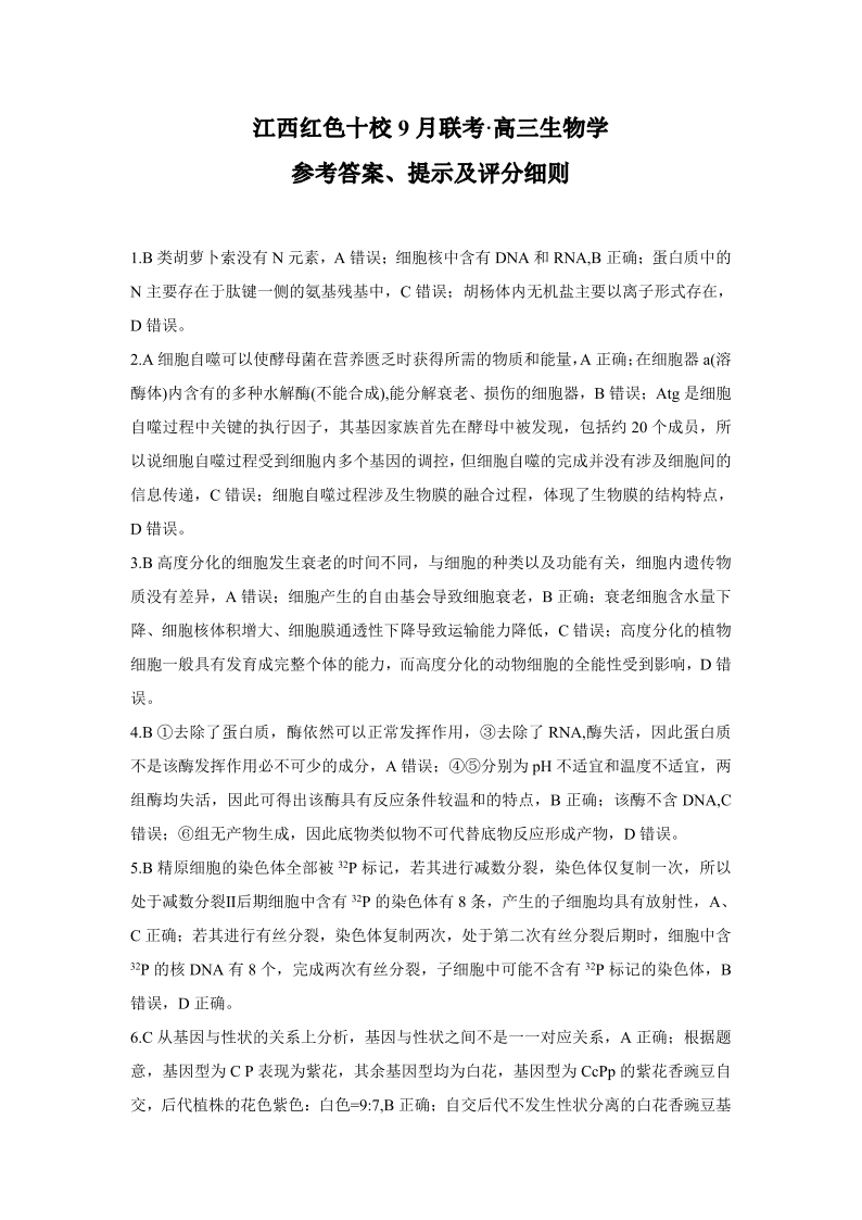 2024届江西省红色十校高三上学期9月联考 生物答案