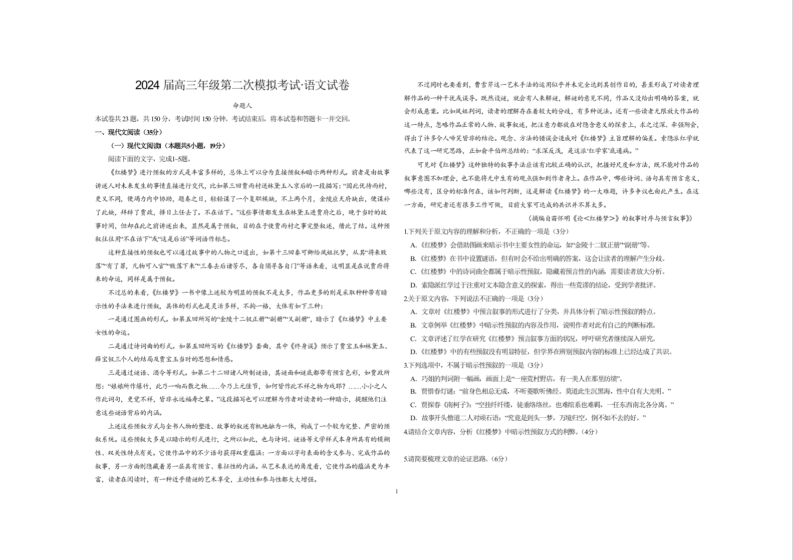 2024届河南省鹤壁市高中高三上学期第二次模拟考试 语文