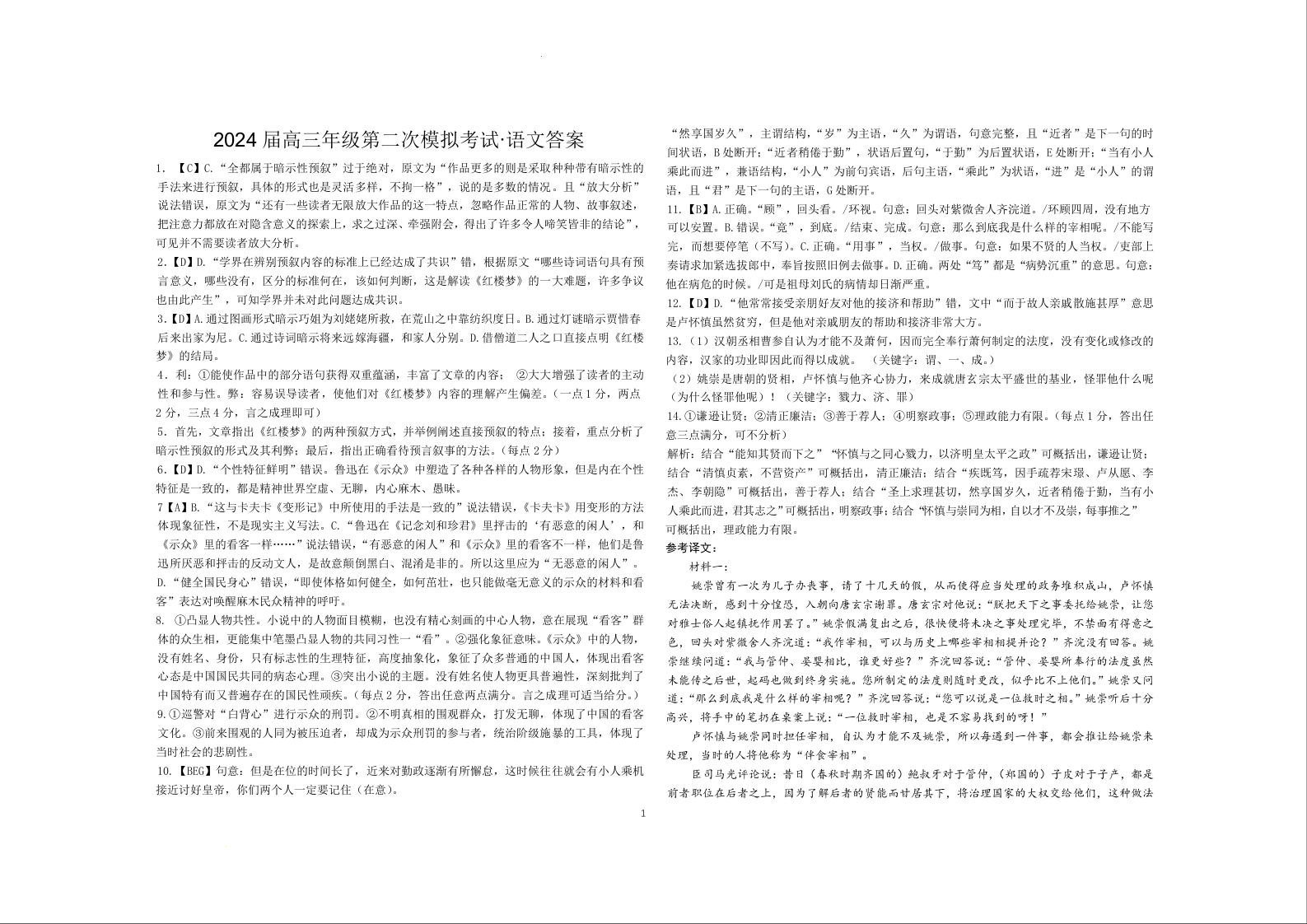2024届河南省鹤壁市高中高三上学期第二次模拟考试 语文答案