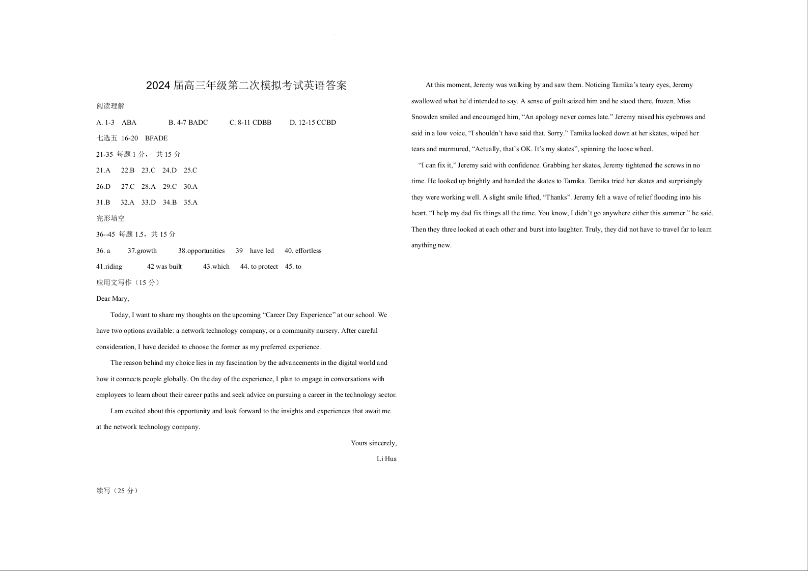 2024届河南省鹤壁市高中高三上学期第二次模拟考试 英语答案