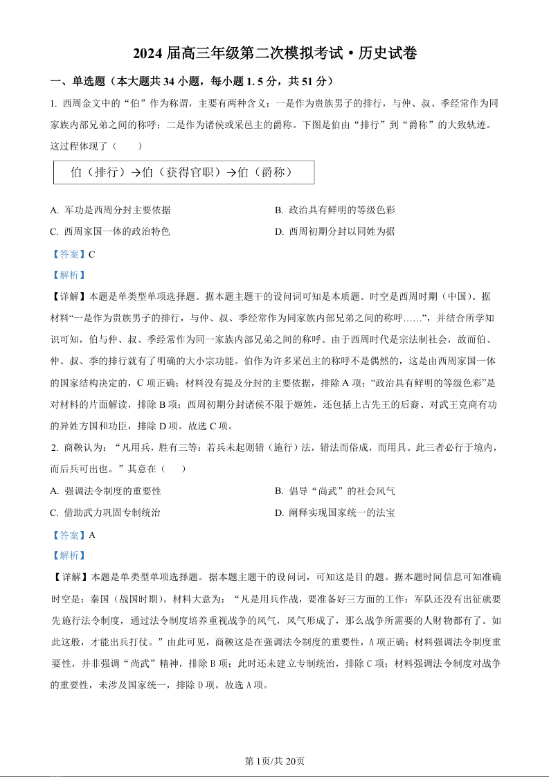 2024届河南省鹤壁市高中高三上学期第二次模拟考试 历史答案