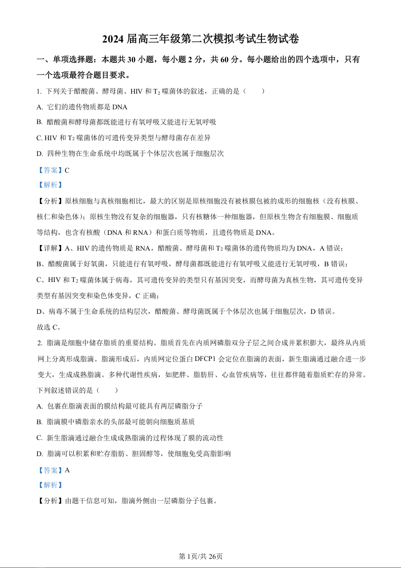 2024届河南省鹤壁市高中高三上学期第二次模拟考试 生物答案