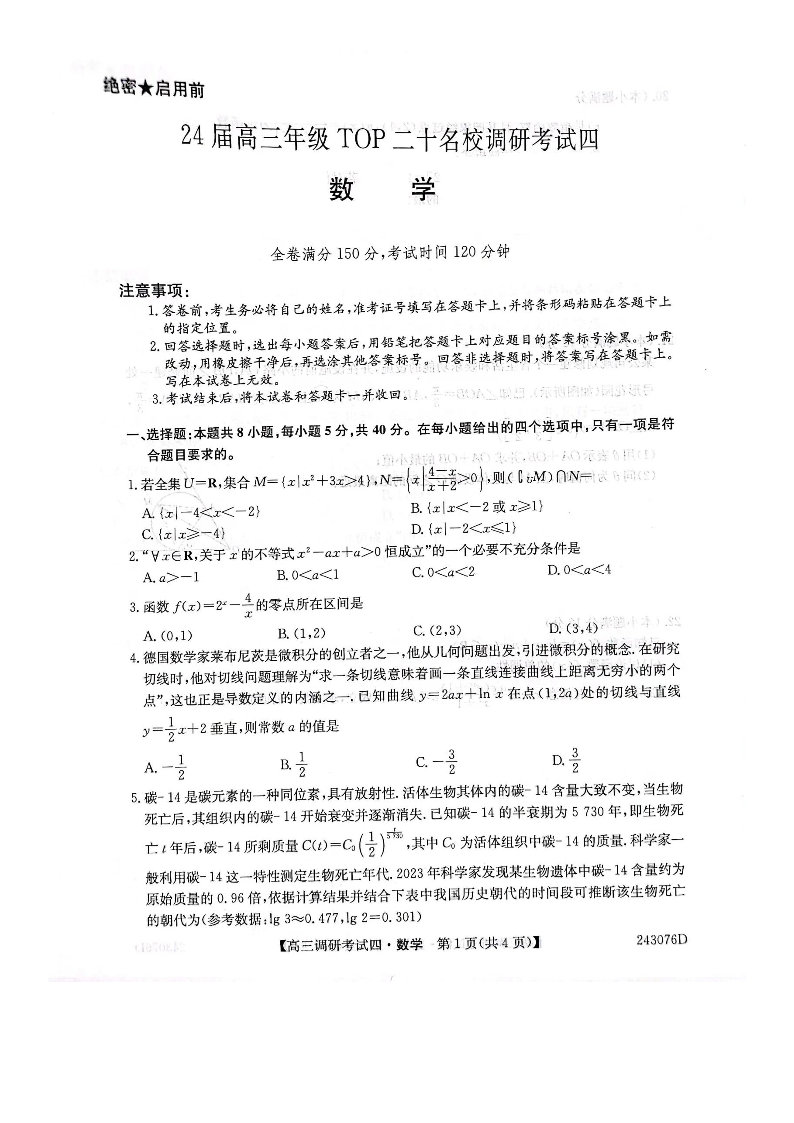 河南省TOP二十名校2024届高三上学期调研考试(四)数学